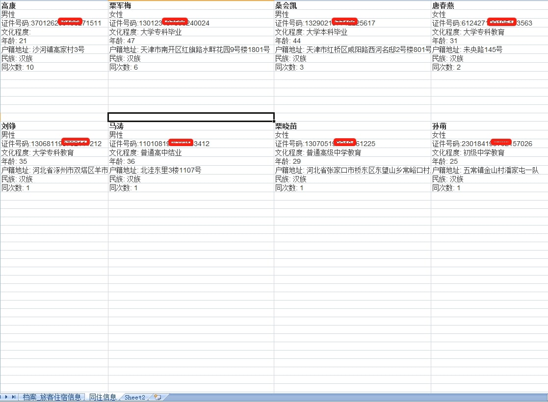 同住人的信息包括:姓名、性别、年龄、身份证号码、身份证地址、同住次数、文化程度、民族等。